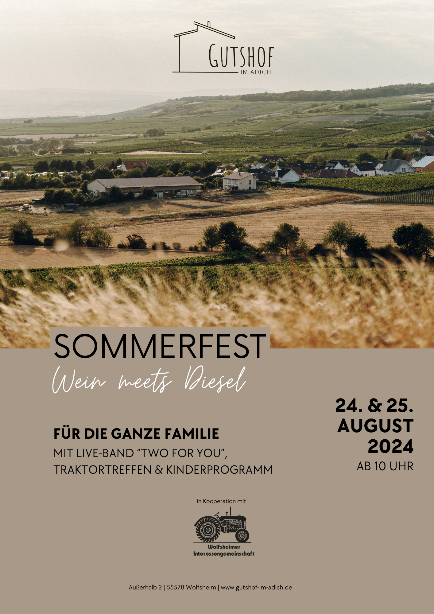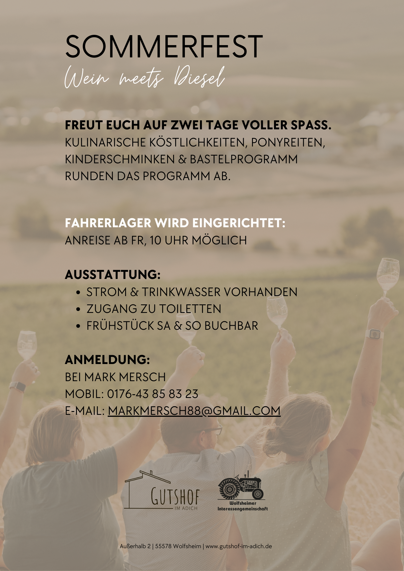 Wir laden Euch gemeinsam mit der Wolfsheimer Interessengemeinschaft zu unserem diesjährigen Sommerfest unter dem Motto “Wein meets Diesel” auf dem Gutshof im Adich ein!